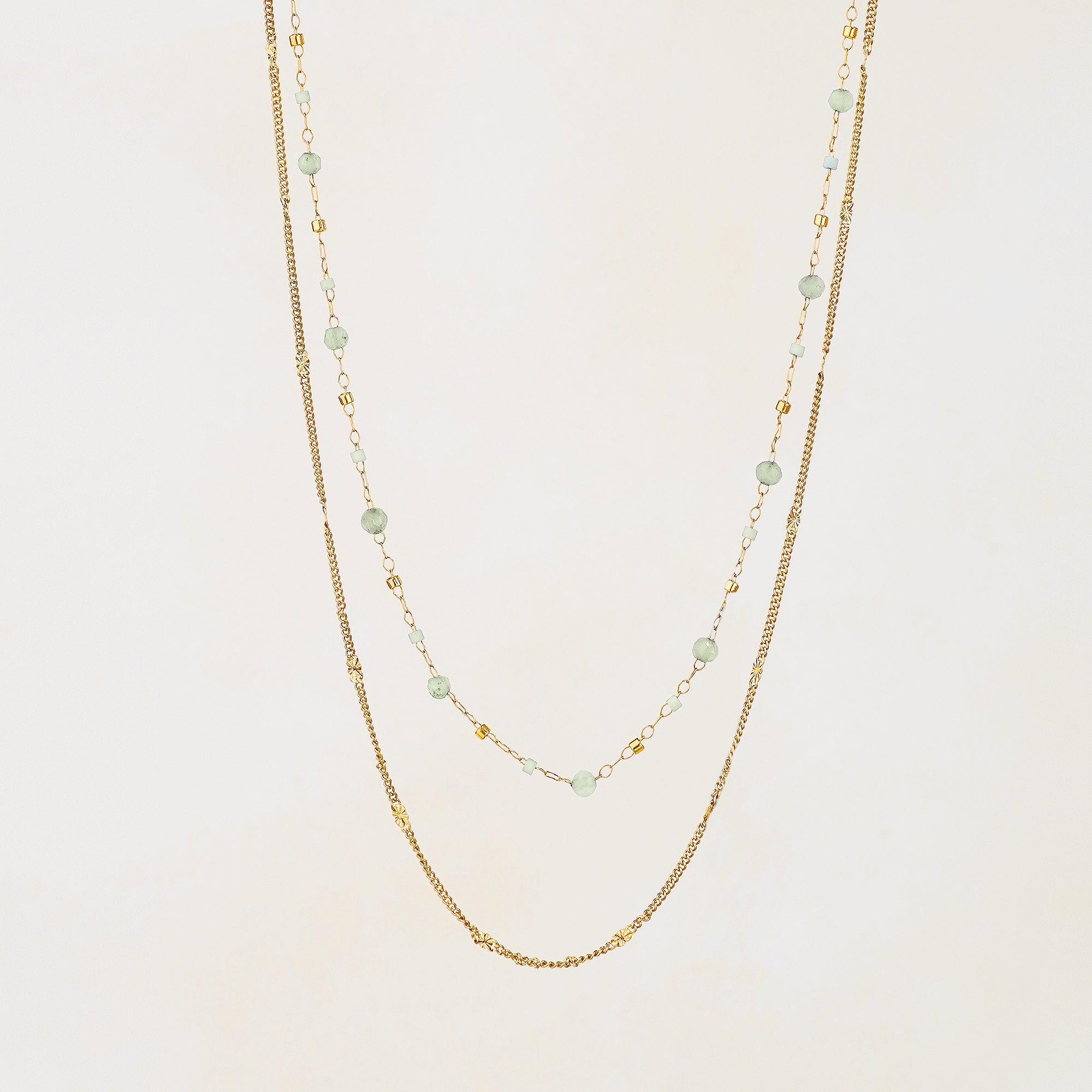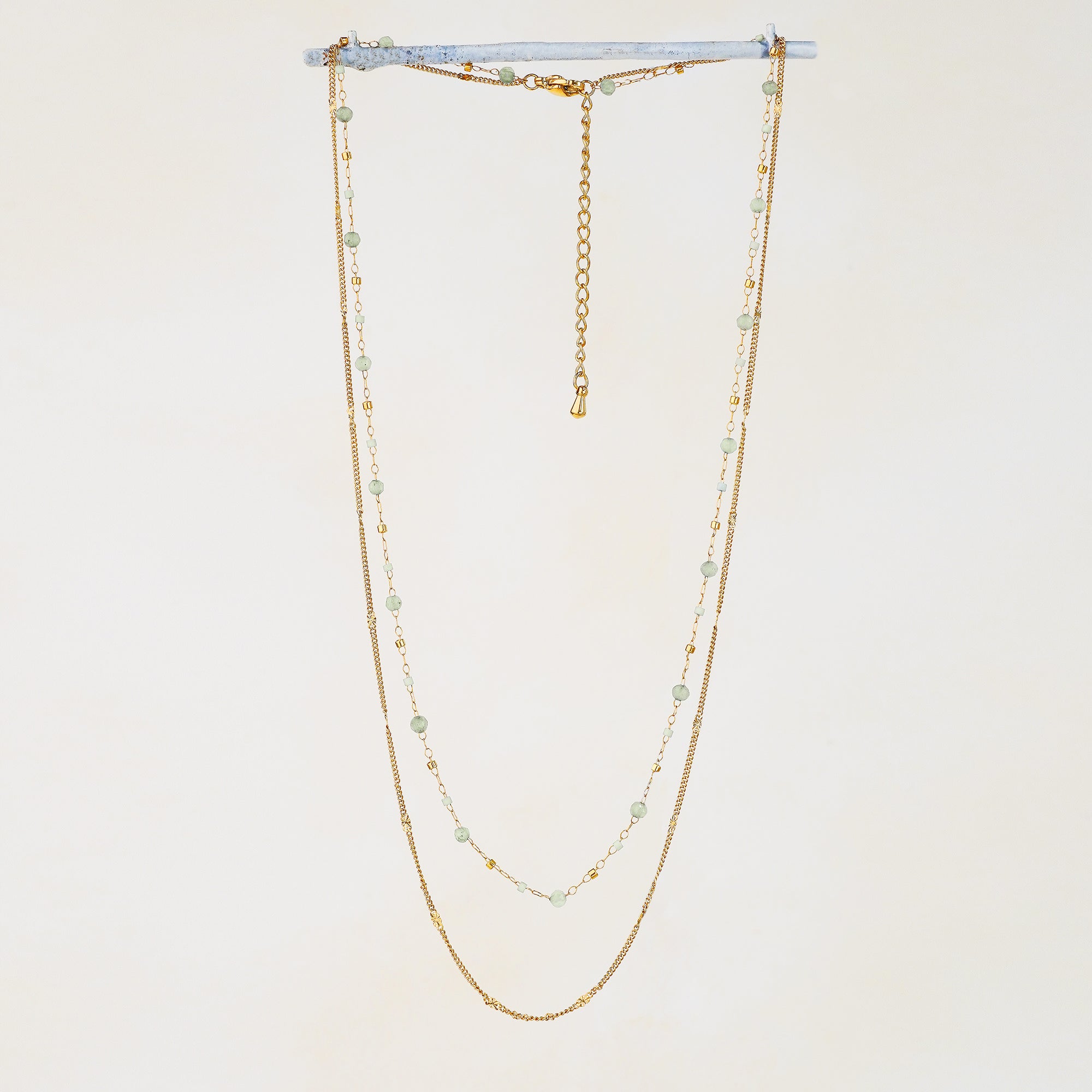 This double strand necklace features soft green aventurine beads paired with a minimalist gold-tone stainless steel chain. Known for its calming, positive energy, green aventurine adds a gentle earthy tone—perfect for everyday wear or layering. Lightweight, hypoallergenic, and effortlessly refined.