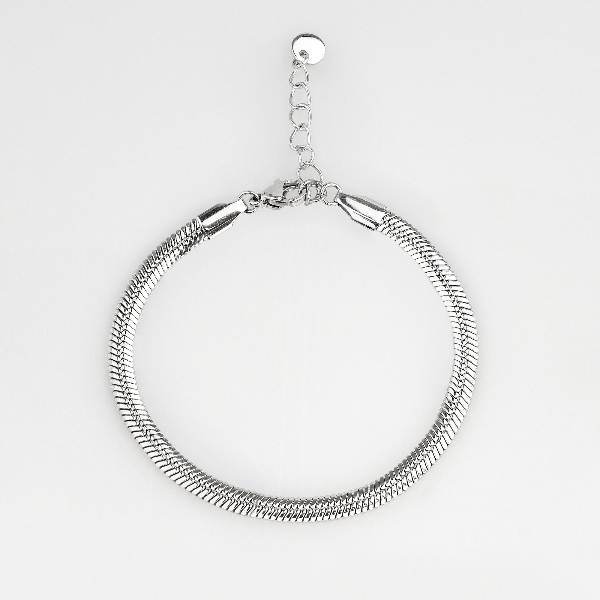 A sleek snake chain bracelet with an elegant silver shine. Flexible, lightweight, and comfortable for everyday wear. Perfect to wear on its own or layered with other accessories.