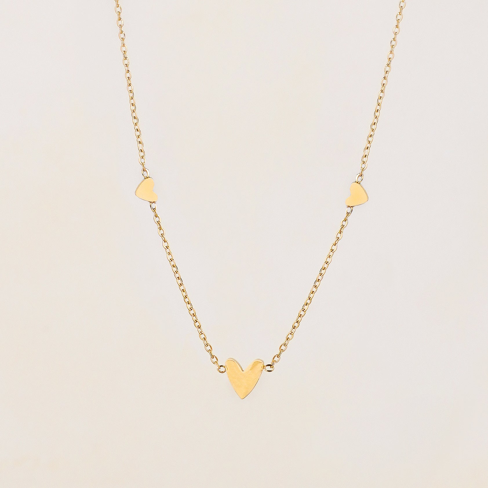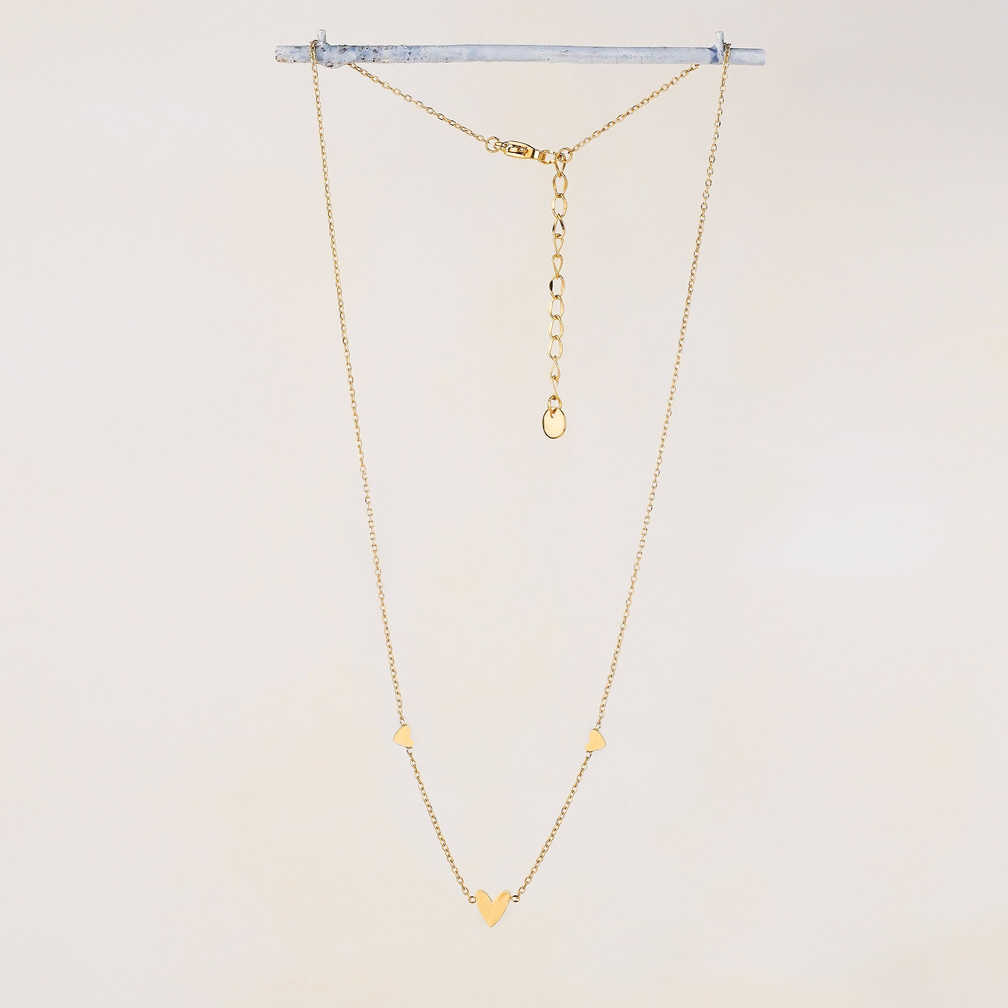 The Tria Necklace features three tiny heart charms in a delicate row, suspended from a fine gold-tone stainless steel chain. Simple yet full of charm, it’s a subtle expression of love—perfect for everyday wear, layering, or gifting to someone special.