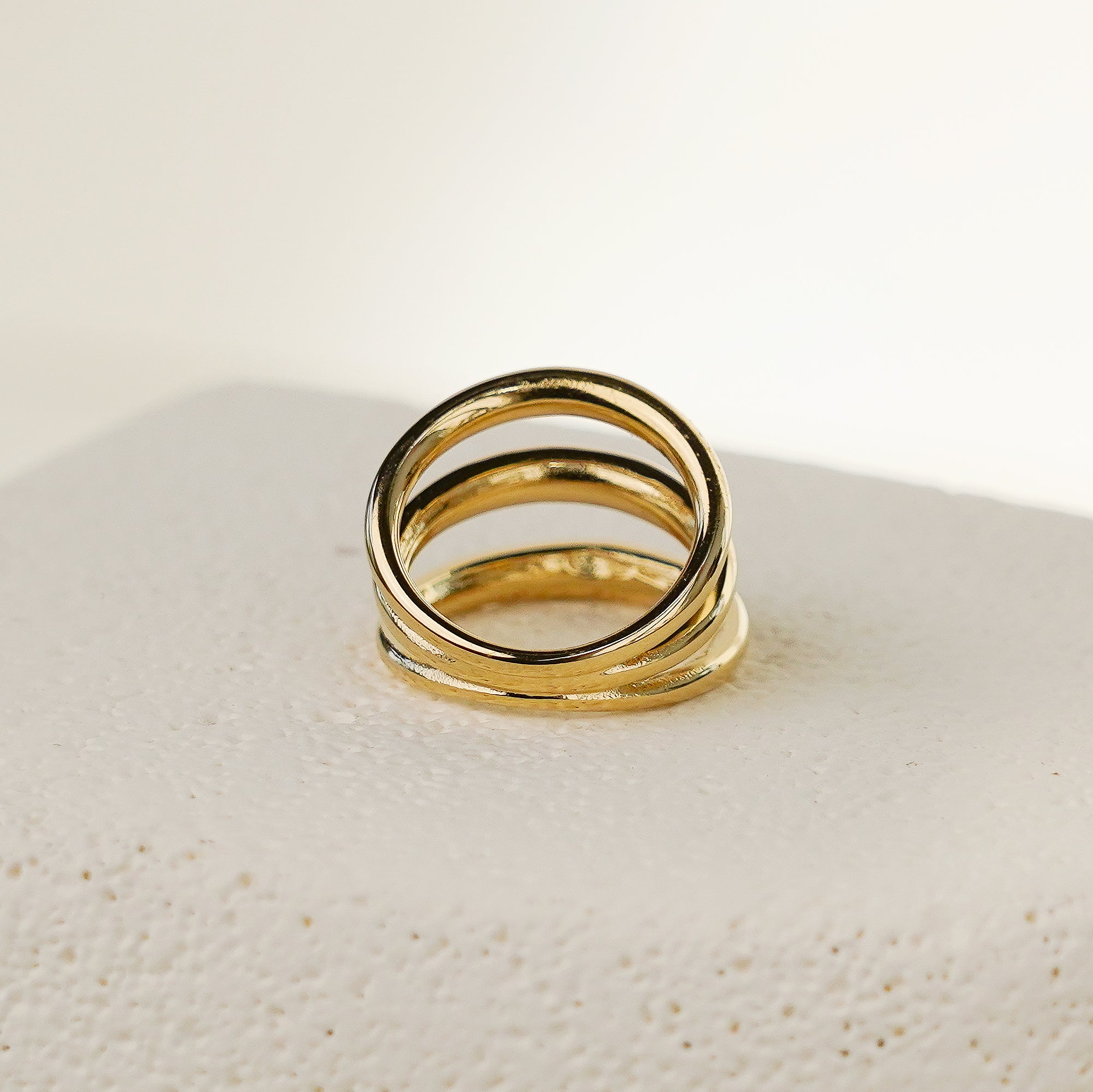 The Thara Triple Ring features an elegant interlocking design of three slim gold-tone stainless steel bands. Minimal yet striking, it gives the illusion of perfectly stacked rings—without the hassle. A sleek everyday piece with timeless appeal.
