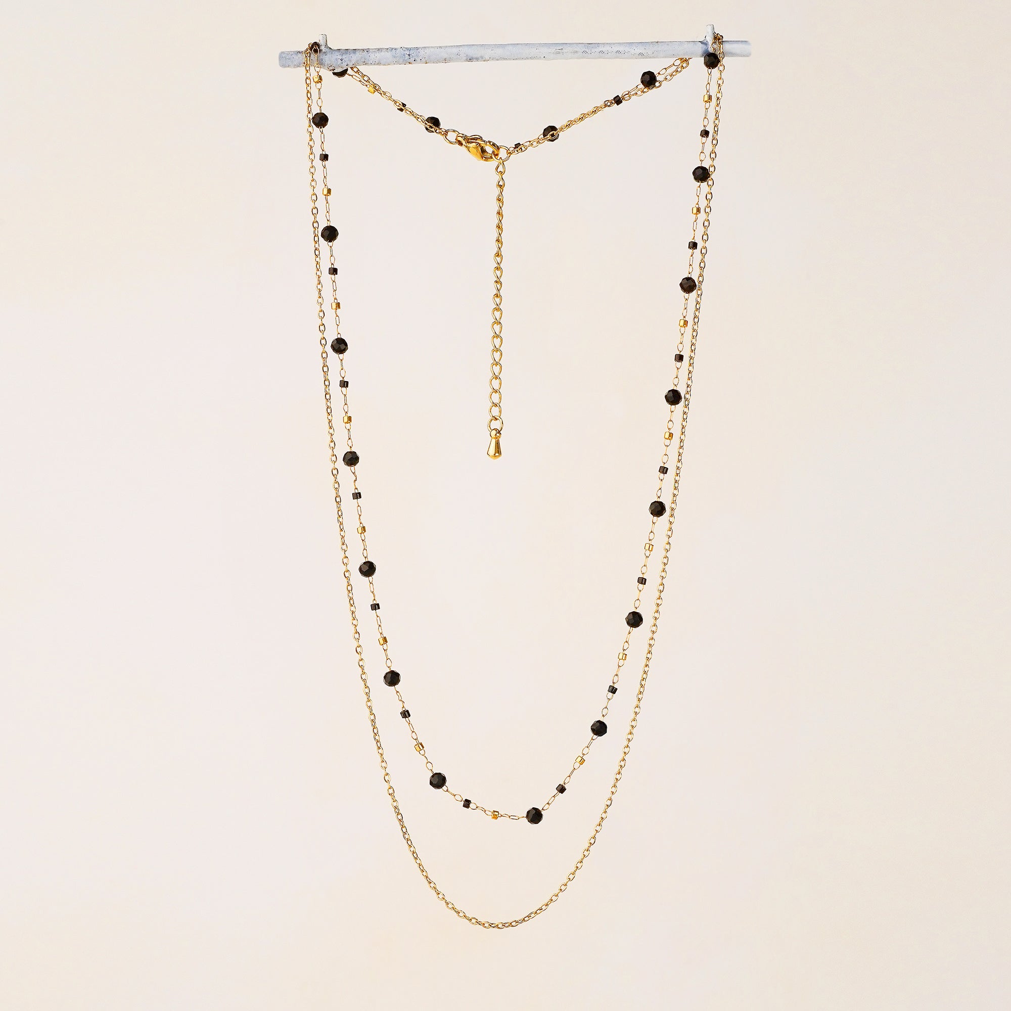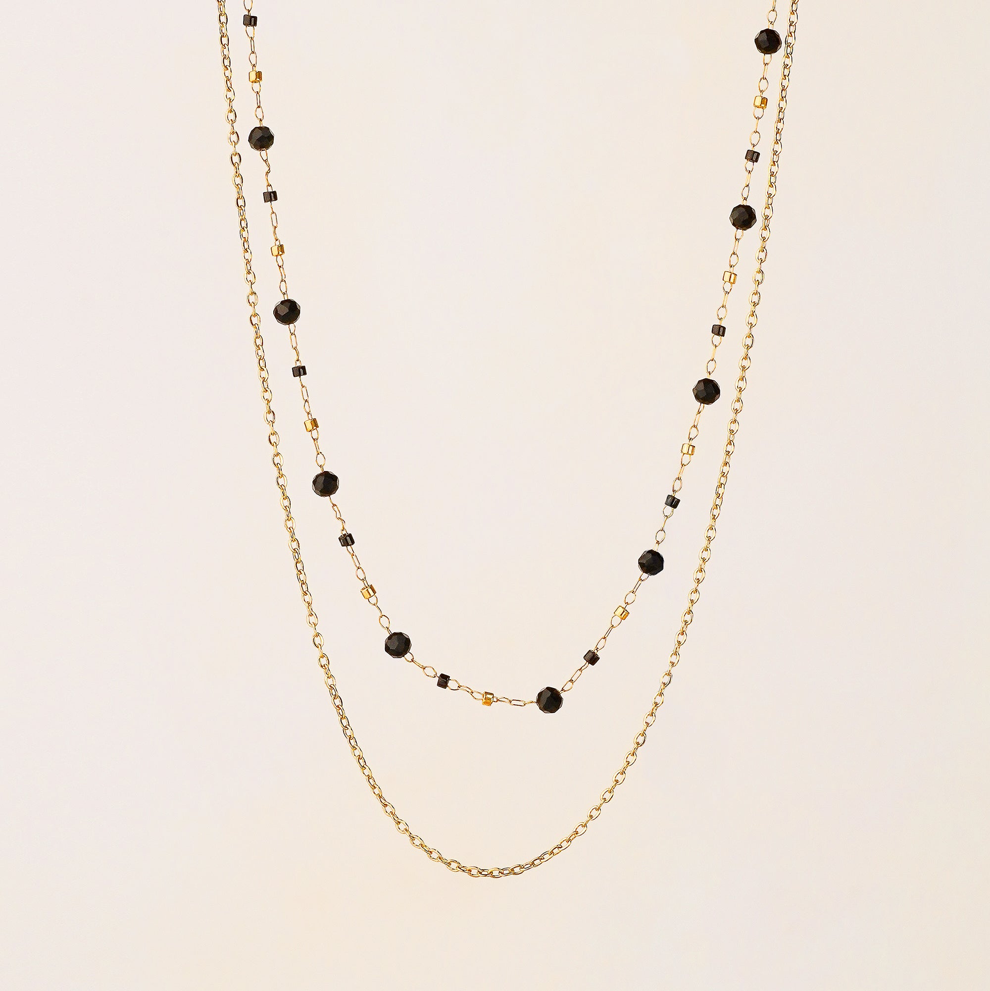 This double-strand necklace features polished black agate beads paired with a sleek gold-tone stainless steel chain. The combination brings contrast and depth—balancing natural texture with modern shine. Elegant enough for evening, effortless enough for day