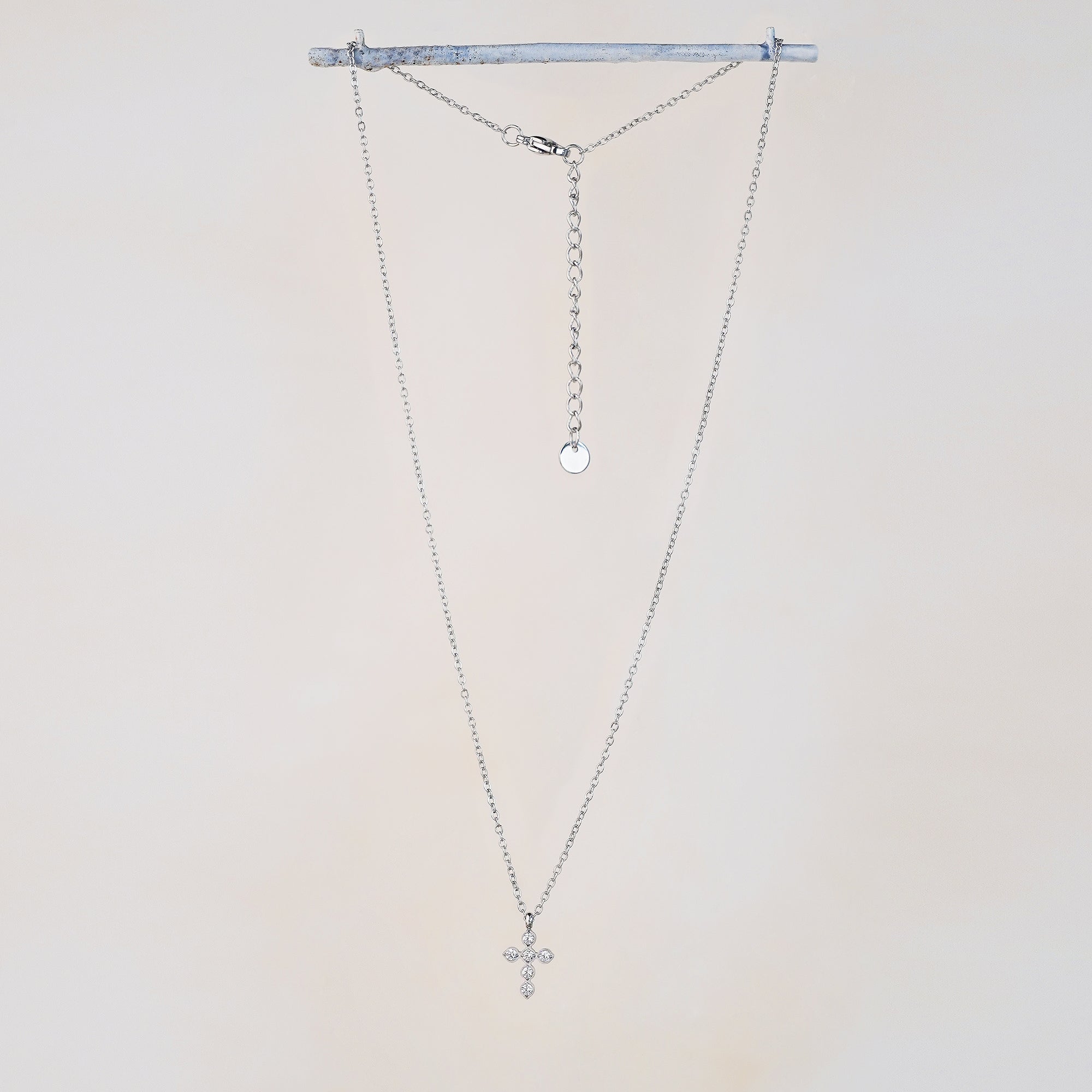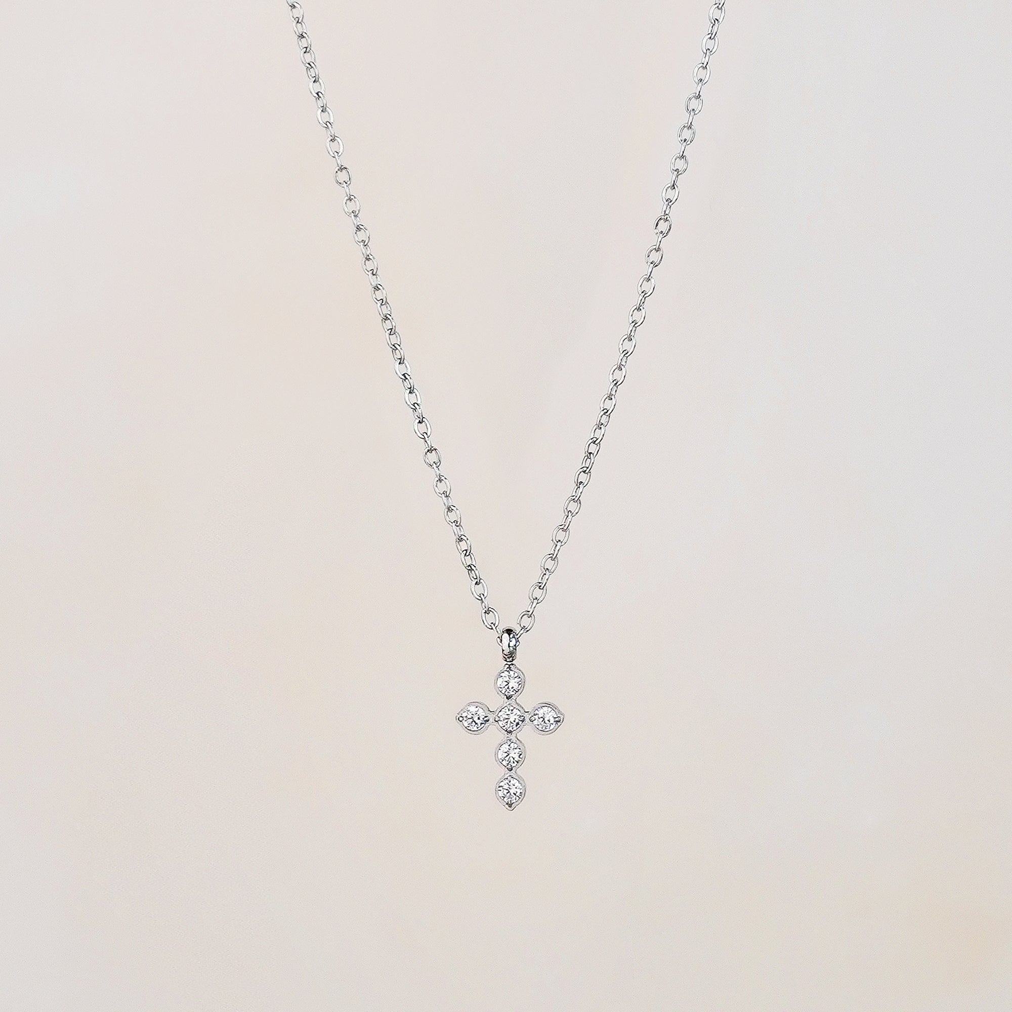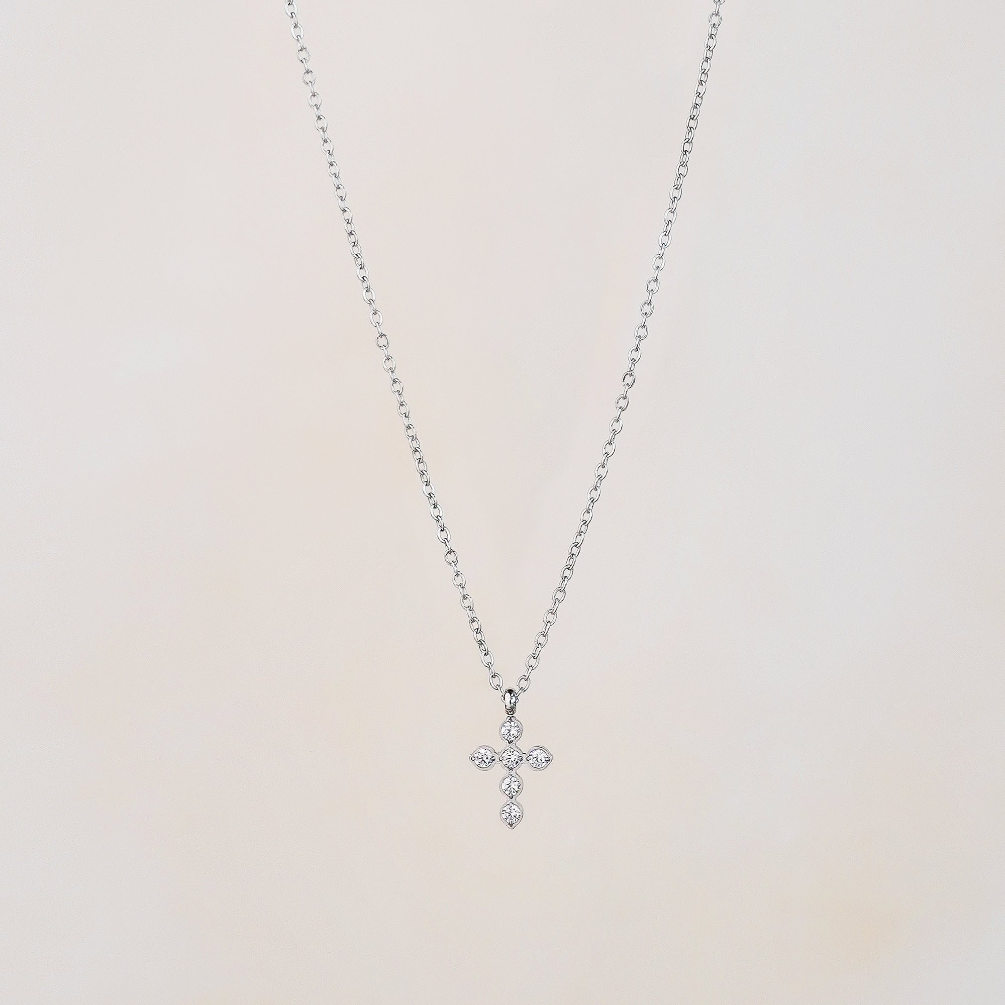 This necklace features a classic cross pendant adorned with sparkling white cubic zirconia, suspended on a fine silver-tone stainless steel chain. It’s a refined piece that brings together elegance and symbolism—perfect for layering or wearing solo.