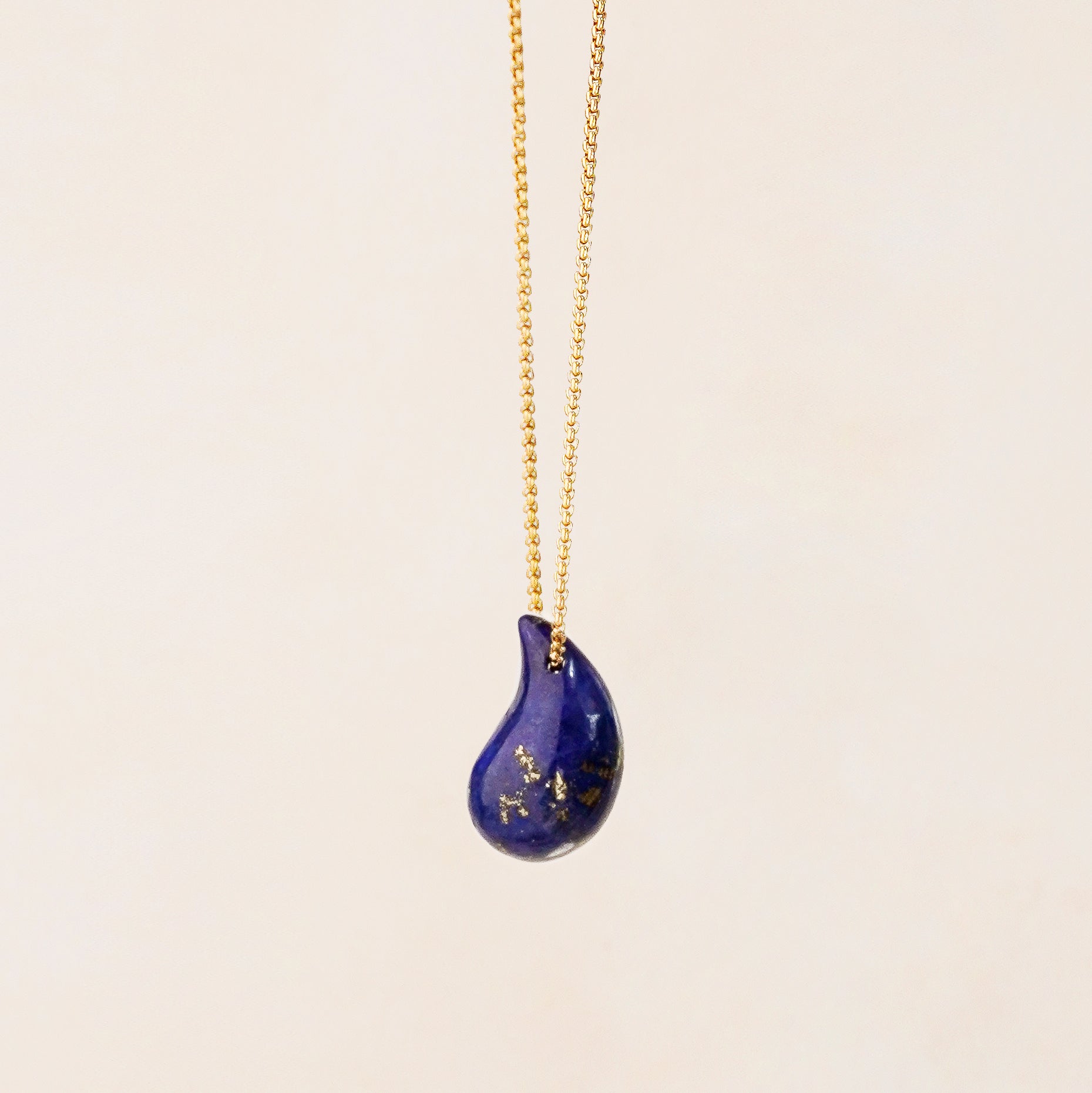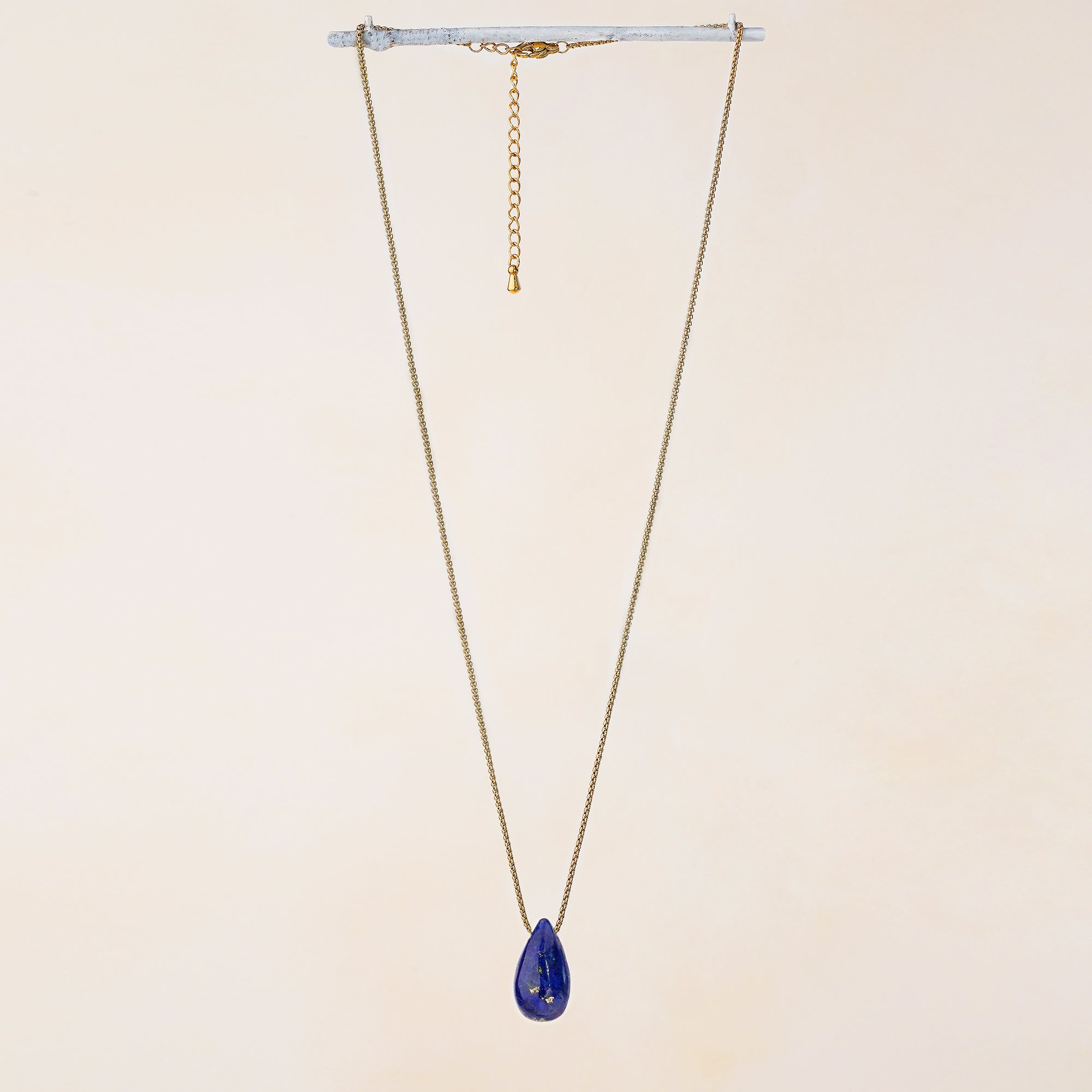 The Vira Necklace features a large teardrop-shaped lapis lazuli pendant suspended from a sleek gold-tone stainless steel chain. Known for its rich celestial hue and natural gold flecks, lapis lazuli brings both beauty and symbolism—representing wisdom, clarity, and inner strength.